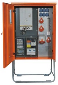 Schrankschutzart IP 44 (innere Bedienfront IP 21), Schutzisolierung bis einschl. FI-Schalter. Gehäuse aus verzinktem Stahlblech mit schwenkbaren Kranösen und Tragegriffen, Türverschluss mit Fallriegel sowie eingebauter Torsions-Rückzugsfeder zum sicheren Einrasten, verschließbar mittels Vorhängeschloss (bauseits), Lackierung RAL 2004 orange, Fußgestelle feuerverzinkt mit Befestigungslaschen für Erdnägel.